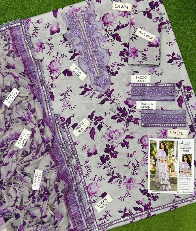 Made from premium lawn 90/88 fabric, this outfit features allover printed lawn, enhanced with 9mm heavy sequence embroidered patches on the neck, daman, sleeves, and trouser. The look is completed with a digital printed chiffon dupatta, beautifully finished with 4-side 9mm sequence embroidered patti, giving the suit a true luxury designer feel.