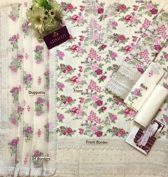 The outfit includes a chiffon dupatta with 4-sided embroidered borders, adding a soft and luxurious touch.