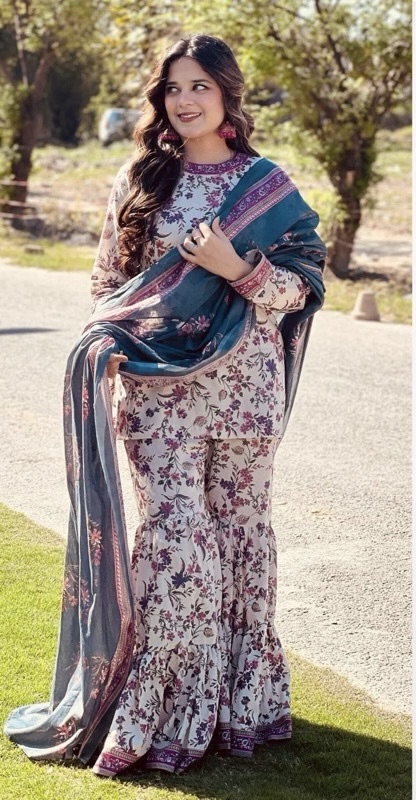 The shirt and dupatta feature delicate digital prints, bringing in a touch of sophistication. These designs reflect the charm of winter hues, making the outfit elegant yet trendy.