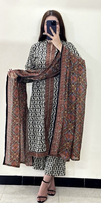 The shirt and dupatta feature delicate digital prints, bringing in a touch of sophistication. These designs reflect the charm of winter hues, making the outfit elegant yet trendy.