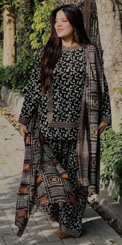 The shirt and dupatta feature delicate digital prints, bringing in a touch of sophistication. These designs reflect the charm of winter hues, making the outfit elegant yet trendy.