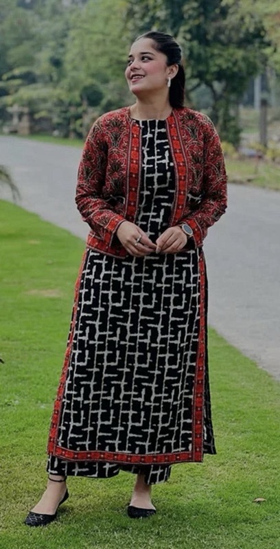 The shirt and dupatta feature delicate digital prints, bringing in a touch of sophistication. These designs reflect the charm of winter hues, making the outfit elegant yet trendy.