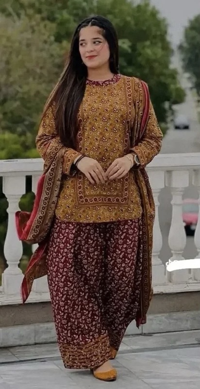 The shirt and dupatta feature delicate digital prints, bringing in a touch of sophistication. These designs reflect the charm of winter hues, making the outfit elegant yet trendy.