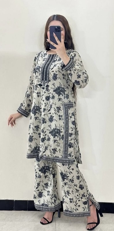 The shirt and dupatta feature delicate digital prints, bringing in a touch of sophistication. These designs reflect the charm of winter hues, making the outfit elegant yet trendy.