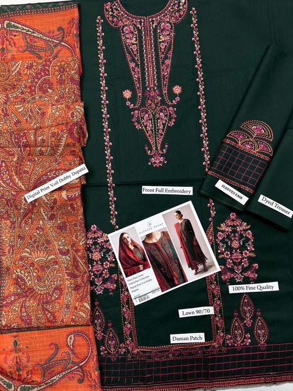 Hussain Rehar IA-16 is a premium luxury lawn 3 piece unstitched suit with heavy embroidery and a digital print voile dobby dupatta, perfect for Eid Collection 2026.