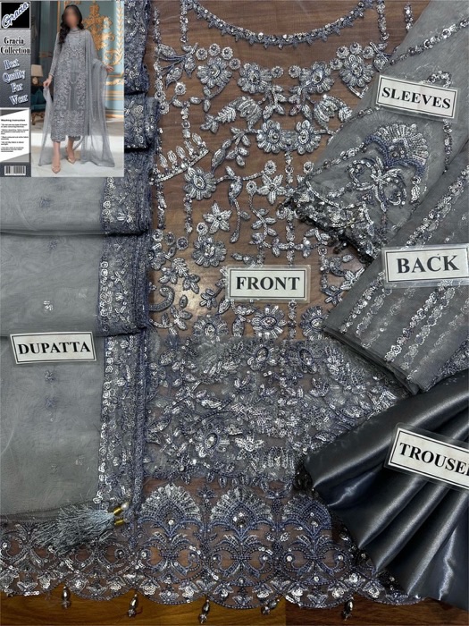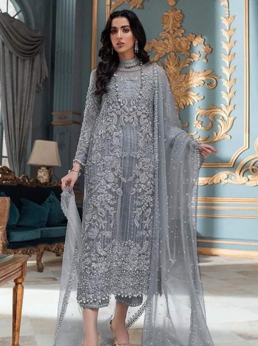 Buy Laam LM-787 luxury net 3 piece suit with sequence embroidery and satin silk trouser. Perfect for weddings and formal events.