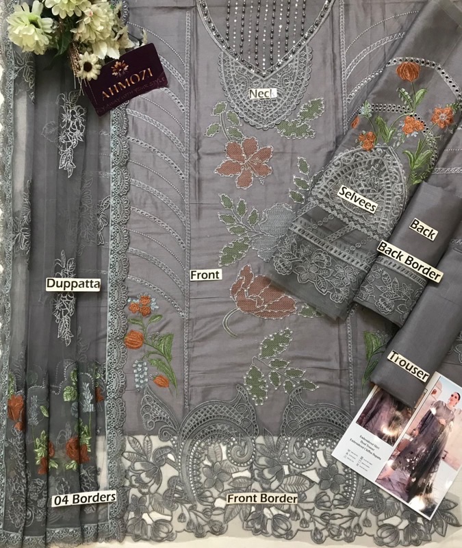 This design features a fully heavy embroidered lawn shirt with scifflie panels, multi-thread centre panel embroidery, cutwork daman border, and a heavily embroidered neckline enhanced with beads work. The look is completed with a fully embroidered net dupatta with heavy borders and pallou detailing, paired with a dyed cambric trouser with embroidered border.