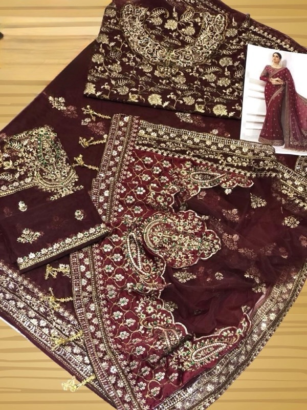 Maria B MB-612 is a premium bridal saree crafted on net fabric with heavy embroidery, sequence work, stone hand embellishments, and a luxurious silk pallu—perfect for weddings and formal occasions.