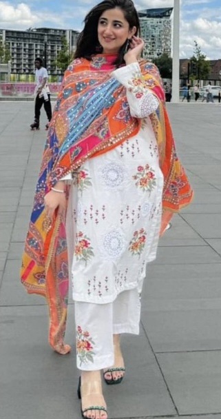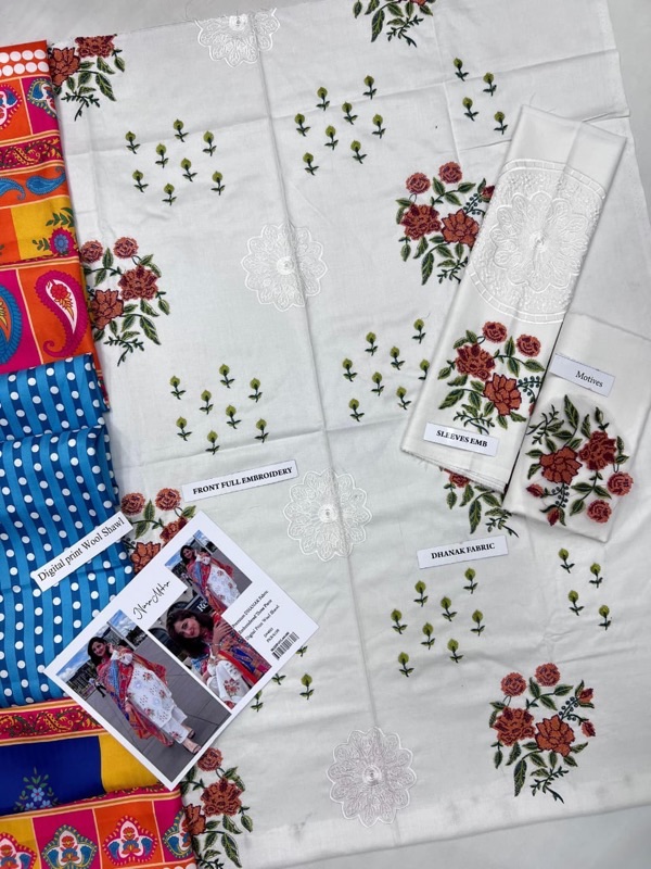Nimra Mehra NM-638 premium Dhanak 3 piece embroidered winter suit with digital wool shawl. Elegant, warm, and perfect for all winter occasions.