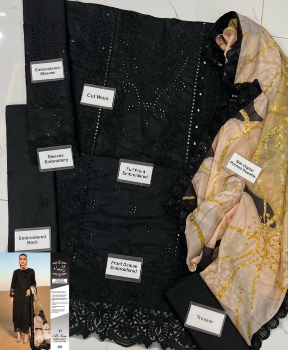 One of the standout features of this suit is its digital printed silk dupatta. It is beautifully finished with four-sided sequence embroidered lace, giving it a luxurious and festive appeal. The smooth texture and shine of silk enhance your overall look, whether worn during the day or evening.