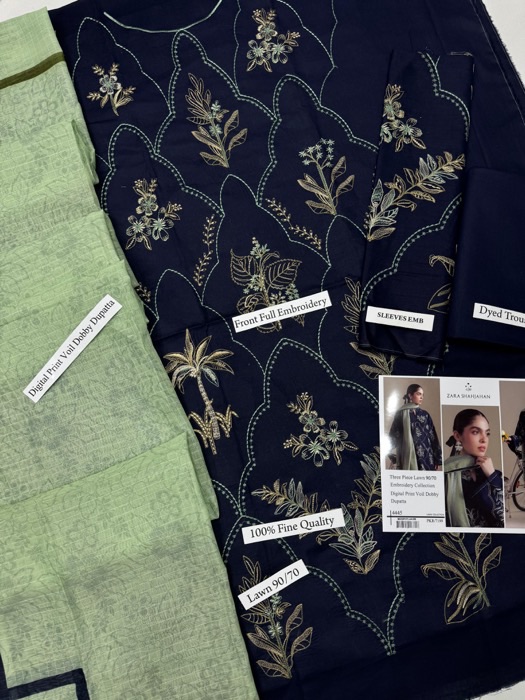 Zara Shahjahan IA-133 lawn suit with heavy embroidery, dyed trouser, and digital print voile dobby dupatta. Perfect for summer wear.